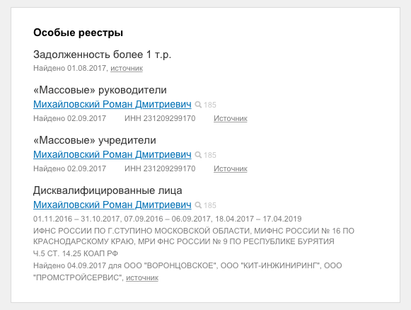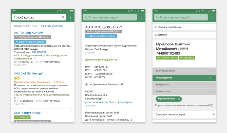 Все данные о контрагенте собраны на одном экране: сведения из ЕГРЮЛ/ЕГРИП, арбитражные дела, выигранные госконтракты, информация о банкротстве и долгах, адреса массовых регистраций и многое другое.